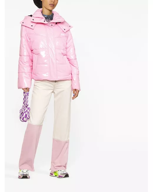 bubblegum pink padded design glossy finish detachable hood funnel neck long sleeves logo print to the front two side welt pockets concealed front fastening straight hem