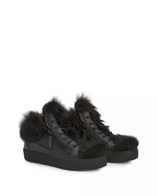 black leather shearling lining faux-fur detailing round toe front lace-up fastening decorative zip detailing mid-top design flat rubber sole