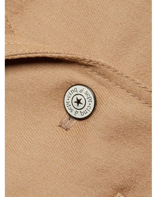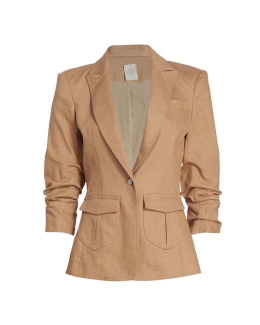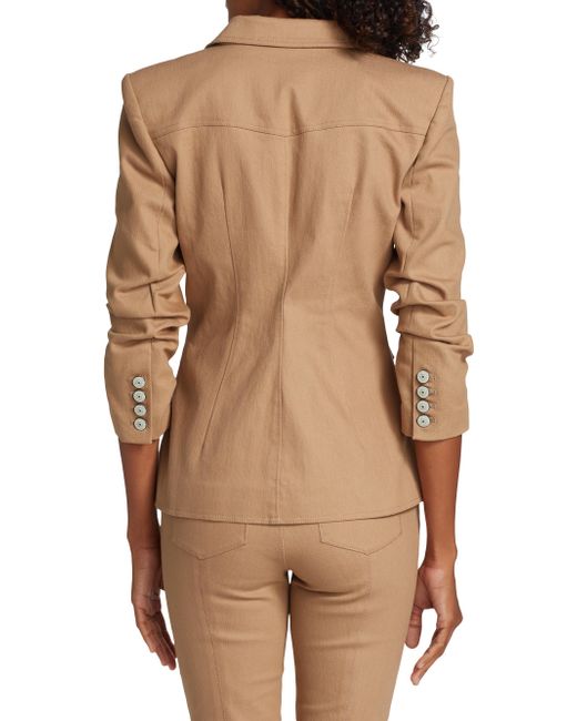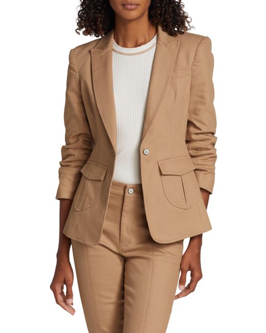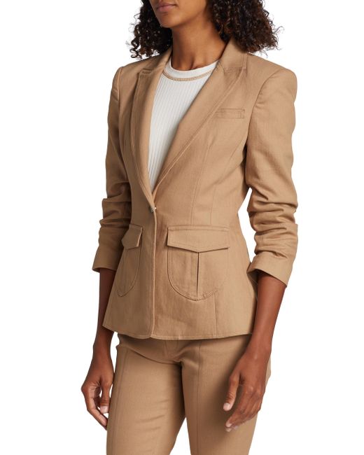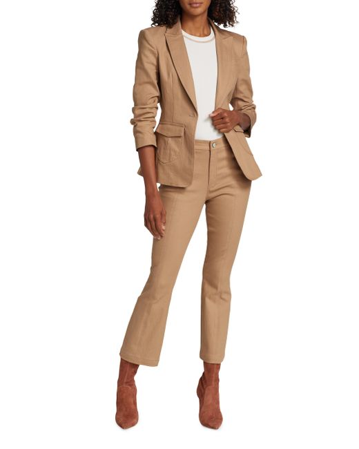 Cinq à Sept's Louisa denim blazer has a tailored fit with a structured peaked collar, ruched sleeves and patch pockets. Peak lapels Three-quarter sleeves Front button closure Flap pockets 75% cotton/24% polyester/1% elastane Lining: 95% polyester/5% spandex Dry clean Imported SIZE & FIT About 25.5" from shoulder to hem Model measurements: 5'10" tall Model is wearing a US size 4 ABOUT THE BRAND Inspired by the radiant, magical hours between 5 and 7 PM-which is what the label's French name translates to-founder Jane Siskin designs sophisticated, feminine pieces for both workweek and the weekend. The designer's silhouettes also play with volume and eye-catching trimmings-perfect for cocktails or a special night out. Contemporary Sportswear - Workshop > Cinq à Sept > Saks Fifth Avenue > Barneys. Cinq à Sept. Color: Sahara. Size: 2.