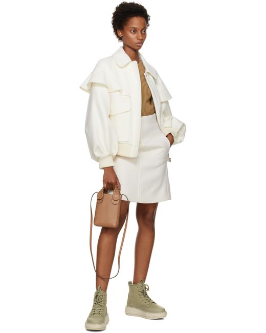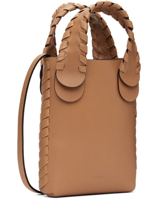 Grained leather shoulder bag in tan. Blanket stitching throughout. · Fixed shoulder strap · Carry handles · Logo embossed at face · Suede lining · H7 x W5 x D1.25 in Supplier color: Light tan
