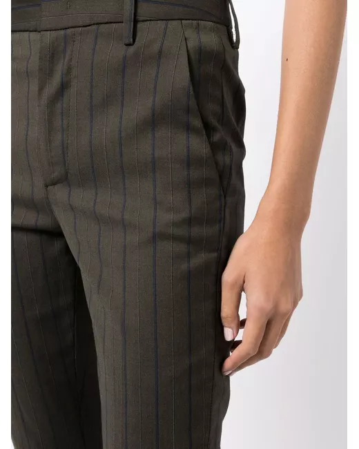 cedar brown pinstripe pattern logo plaque belt loops cropped leg turn-up hem concealed front fastening two rear jetted pockets