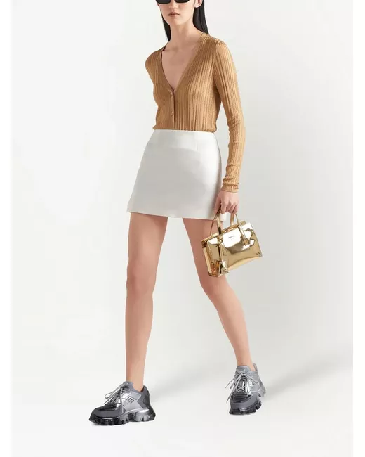 gold-tone lamé effect triangle logo front button fastening V-neck long sleeves straight hem