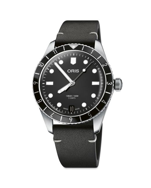 From the Divers 65 collection. The spirit of Oris' first diver's watch, introduced in 1965, continues to inspire the form of the Divers Sixty-Five, only now it's equipped with Oris Calibre 400, the game-changing automatic. Automatic winding date developed by oris Sapphire, domed on both sides Anti-reflective coating inside Rotating Water resistant to 10 bar Black leather strap Stainless steel buckle Made in Switzerland SIZE Round Case - 40 MM. Fine Jewelry - Fine Watches > Oris > Saks Fifth Avenue > Barneys. Oris.