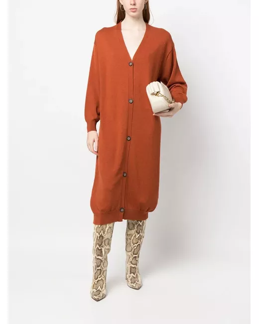 umber orange merino wool blend ribbed knit front button fastening V-neck long sleeves long length