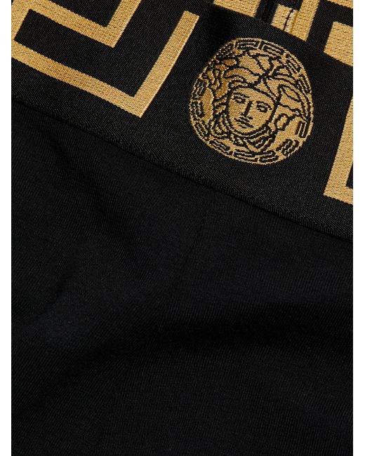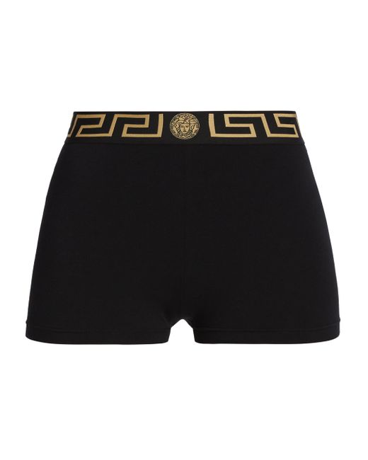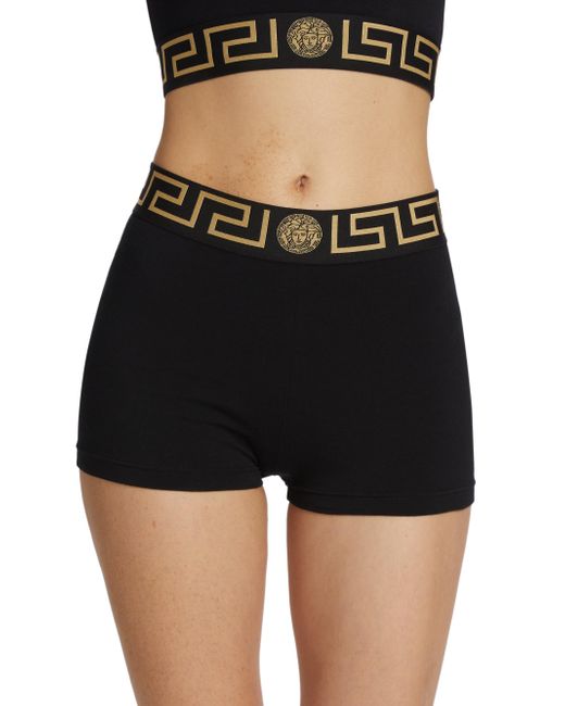 Versace's Icon shorts spotlight a fitted silhouette and wide elasticized logo waistband. Elasticized logo waistband Pulls on 94% cotton/6% elastane Trim: 82% polyester/9% elastane/9% polyamide Hand wash Made in Italy SIZE & FIT Model measurements: 5'10" tall Model is wearing a US size 4 ABOUT THE BRAND Founded in 1978, Versace is instantly recognizable by the signature Medusa head logo, chosen by founder Gianni Versace for its Greek symbolism. The Italian label is known for its luxe, bold clothing and accessories-think gilding, oversized logos and punchy prints. Since taking over artistic direction, Gianni's sister Donatella Versace has maintained the brand's strong identity, with a renewed vision to give customers the ultimate freedom to express themselves. Lingerie - Designer Foundations > Versace > Saks Fifth Avenue > Barneys. Versace. Color: Black. Size: XL.