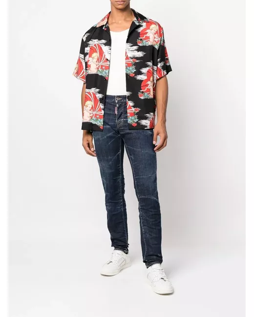 indigo blue cotton blend logo patch to the rear front button fastening two diagonal pockets to the sides two rear patch pockets