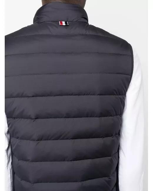 navy blue down-feather filling signature grosgrain loop tab quilted front zip fastening front zip fastening pockets sleeveless side stripe detailing curved hem