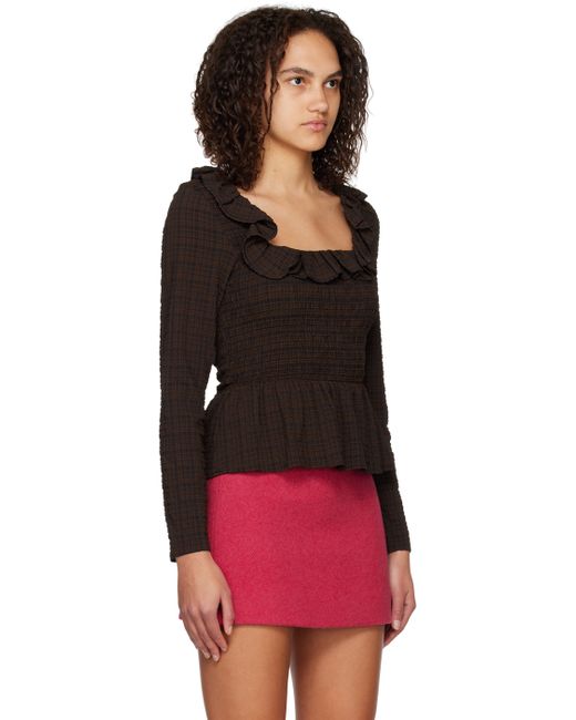 Stretch recycled polyester-blend seersucker blouse. Check pattern and shirring throughout. · Ruffles at square neck · Peplum hem Supplier color: Chicory coffee