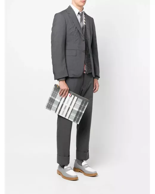 grey leather check pattern signature grosgrain loop tab logo print to the front top zip fastening main compartment