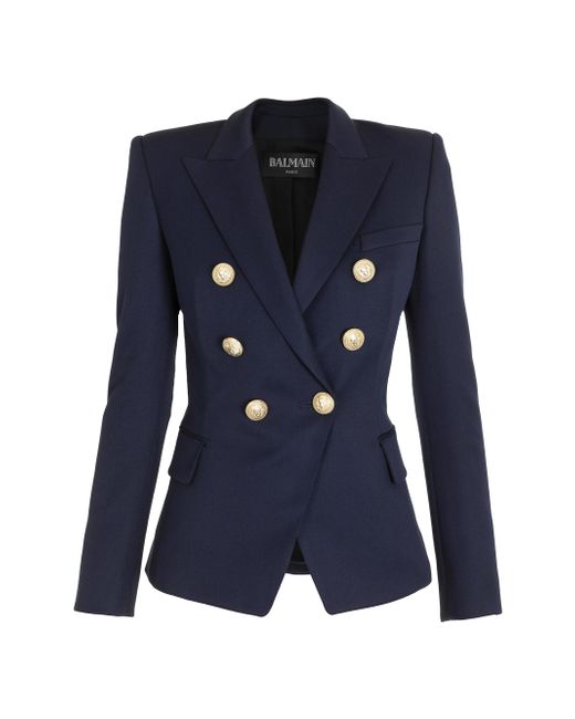 Woven from a luxe wool, Balmain's double-breasted jacket is finished with embossed goldtone button closures. Peak lapels Long sleeves Chest welt pocket Double-breasted button front Waist flap pockets Goldtone hardware 100% wool Dry clean Imported SIZE & FIT Model measurements: 5'10" tall Model is wearing a US size 4 ABOUT THE BRAND In 1945, founder Pierre Balmain made his well-received debut of opulent, ultra-feminine designs. Known today for its iconic blazers, impeccably constructed dresses and signature fragrances, the brand continues its dedication to masterful tailoring and elegance under the helm of Creative Director Olivier Rousteing. Designer Rtw - Balmain > Balmain > Saks Fifth Avenue > Barneys. Balmain. Color: Marine. Size: 12.