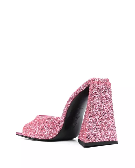 pink calf leather sequin embellishment branded footbed square toe open toe high block heel slip-on style