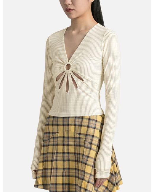 Collina StradaFlower TopLong sleevesMade from deadstock seersucker fabricStripedV-NeckThumbholeO-ring flower cut-out detailPartial mesh liningColor: Seersucker