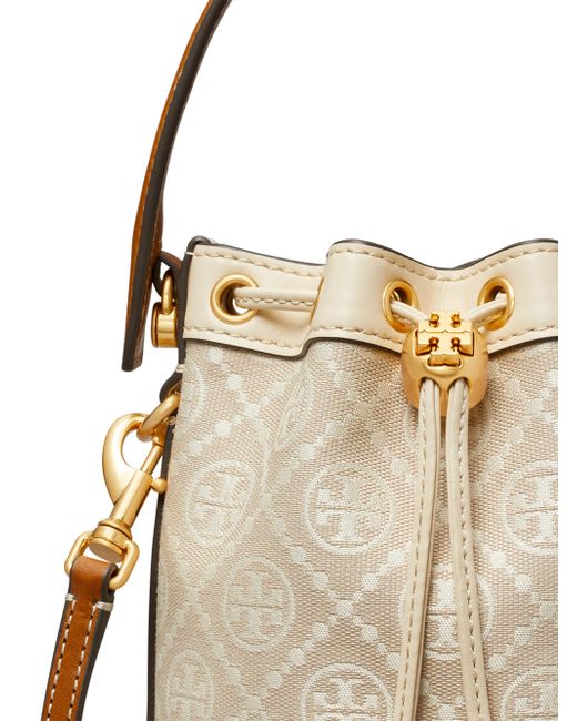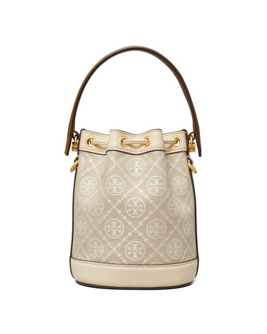 This mini bucket bag from Tory Burch flaunts a T monogram pattern and goldtone hardware. Top handle Removable, adjustable shoulder strap Drawstring closure 56% cotton/44% polyester Imported SIZE About 5.5"W x 7.25"H x 3.25"D ABOUT THE BRAND Since debuting her brand in 2004, New York-based designer Tory Burch has made an impact on the fashion world with her handbags and shoes, and playful-yet-polished clothing. Today, Burch remains inspired by color and travel, with her vibrant collections bursting with prints, and her instantly recognizable double-T logo drawing from Moroccan architecture. Handbags - Tory Burch Handbags > Tory Burch > Saks Fifth Avenue > Barneys. Tory Burch. Color: Ivory.