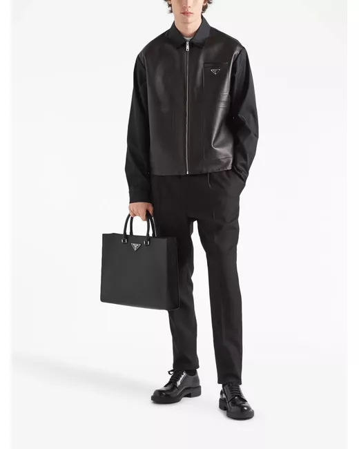 black leather/recycled nylon panelled design classic collar chest patch pocket enamel triangle logo front zip fastening two side patch pockets buttoned cuffs straight hem