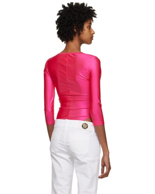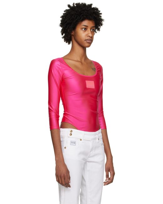 Stretch nylon jersey bodysuit. · Boat neck · Logo patch at chest · Adjustable hook-eye fastening at bottom Supplier color: Hot Pink