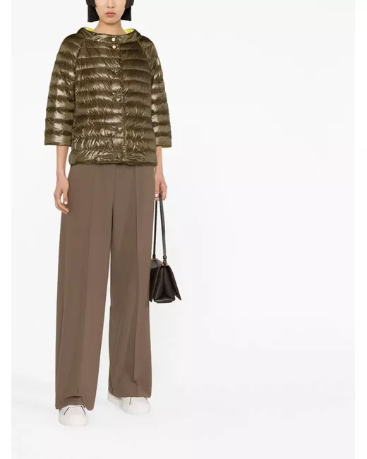 reversible quilted jacket from HERNO featuring dark green, lemon yellow, feather down, quilted, padded design, reversible, round neck, front press-stud fastening, three-quarter length sleeves and straight hem.