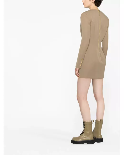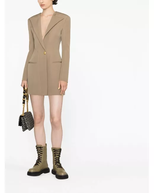 beige wool shoulder pads wide peak lapels embossed gold-tone buttons front button fastening long sleeves buttoned cuffs two front welt pockets