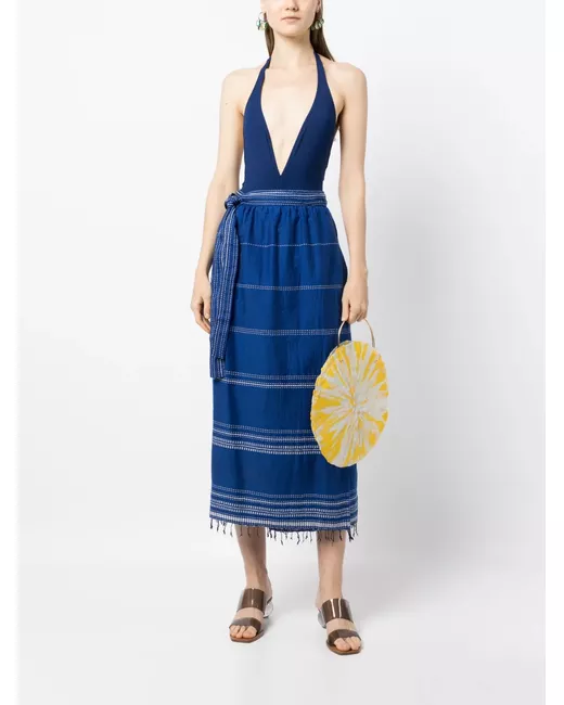blue/white cotton wrap design high-waisted tied waist fringed edge ankle-length