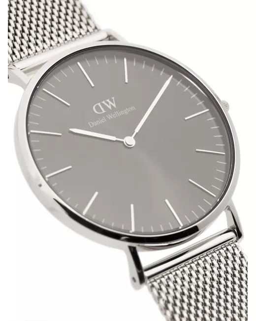 silver-tone stainless steel quartz movement anthracite grey sunray-finish dial index dial stick hands mesh bracelet folding clasp water resistance up to 30m/3 ATM This item comes with a standard two-year warranty from the brand.