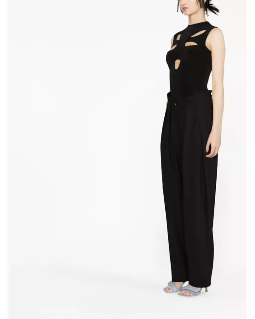 black virgin wool blend embroidered logo to the rear pleat detailing high waist hook and zip fly fastening two rear welt pockets tailored cut