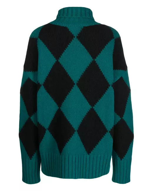 teal green knitted construction argyle intarsia knit roll neck long sleeves straight hem