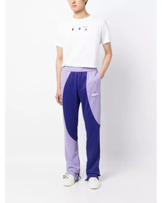 purple cotton blend colourblock design elasticated waistband two side slit pockets logo print at left thigh rear zip-up pocket straight legs