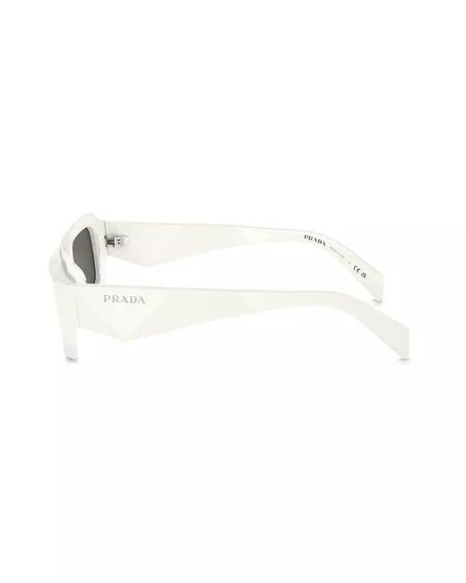 rectangle-frame sunglasses from PRADA EYEWEAR featuring milk white, acetate, grey tinted lenses, rectangle frame, logo print at the arm, straight arms and curved tips. These glasses come with a protective case..