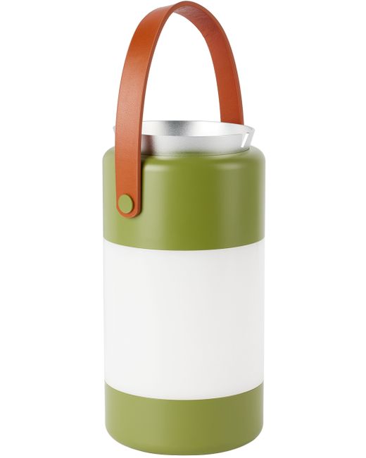 Portable wireless LED lamp in green. Signature detachable anodized aluminium two-piece ashtray at top. Lighter and matchbook compartment at top. · 3-stage touch dimmer / 10, 40, 100% · 360° Acrylite lens · Leather handle · 2700k LED / 300 lm · 5000mAh rechargeable battery · USB-C charging cable · Type-A adapter included / 120 V · H9 x D5 in / 3 lb Supplier color: Green