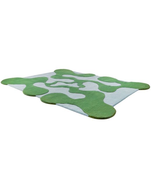 Handcrafted wool pile rug in blue and green. Tufted graphic throughout. H84 x W62.75 in Supplier color: Ice blue & green
