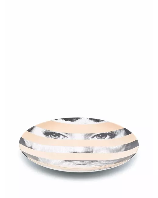 Black/white/gold ceramic face print plate from FORNASETTI featuring face print, metallic finish and round shape.