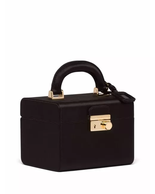 black silk/satin triangle logo engraved logo foldover top single rounded top handle partitioned compartment H10cm x L11cm x W14cm