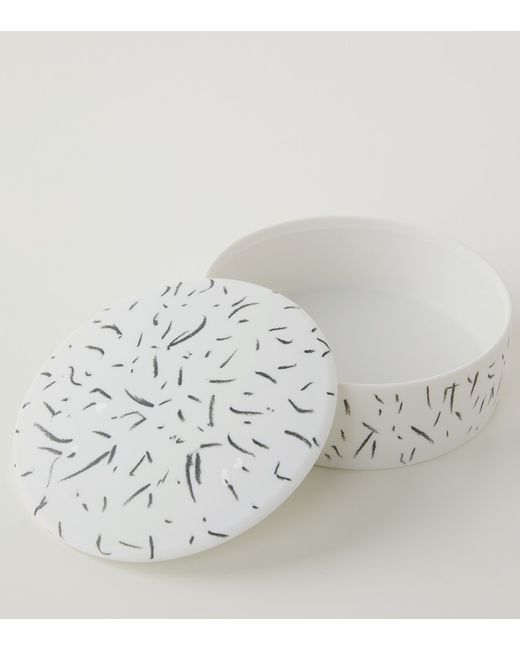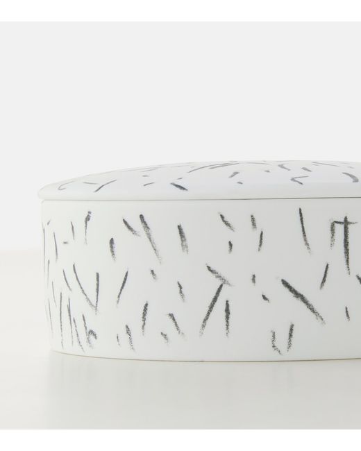 Conceived by research-based design studio Formafantasma for Cassina, the Post Scriptum collection brings together a series of hand-painted porcelain objects inspired by designs from the extensive Ginori 1735 archives. The production process involves hand-drawing graffito motifs onto bisque porcelain and then firing the surface to set the black ceramic chalk. On this short, circular container, the grafitto takes the form of a series of brush stroke-like flecks, producing a sporadic but consistent pattern that covers the exterior and lid.