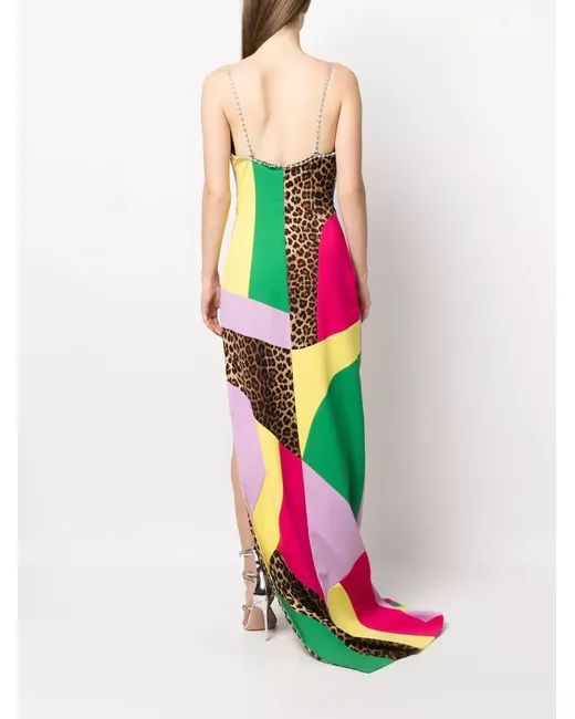 multicolour patchwork design crystal embellishment plunge style spaghetti straps side slit long length