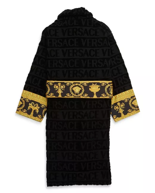 black/yellow gold cotton signature Regalia Baroque print jacquard logo motif shawl lapels two front patch pockets self-tie fastening long sleeves straight hem When buying this unisex item, keep in mind that it is graded in standard men's sizing.