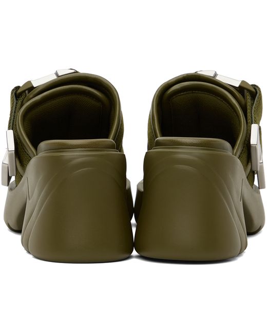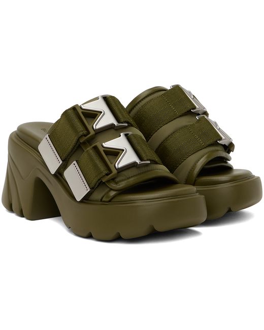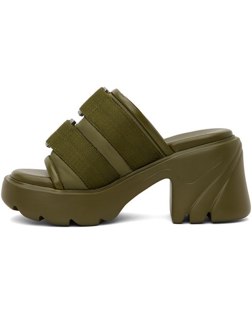 Taffeta slip-on heels in khaki. · Square toe · Mock press-release straps at vamp · Logo-embossed grained leather footbed · Rubber block heel · Treaded rubber platform sole · Platform: H1.5 in · Heel: H3 in Supplier color: Moss