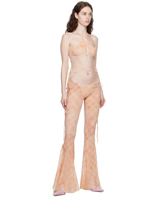 Semi-sheer stretch silk chiffon trousers. Check pattern printed throughout. · Low-rise · Wraparound self-tie straps at waistband · Flared cuffs · Cutout with lace-up detailing at outseams · Concealed zip closure at back Supplier color: Peach bleach
