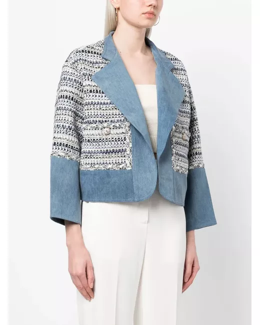 alice blue/multicolour knitted construction notched lapels decorative button detailing long sleeves contrasting collar contrasting border cropped
