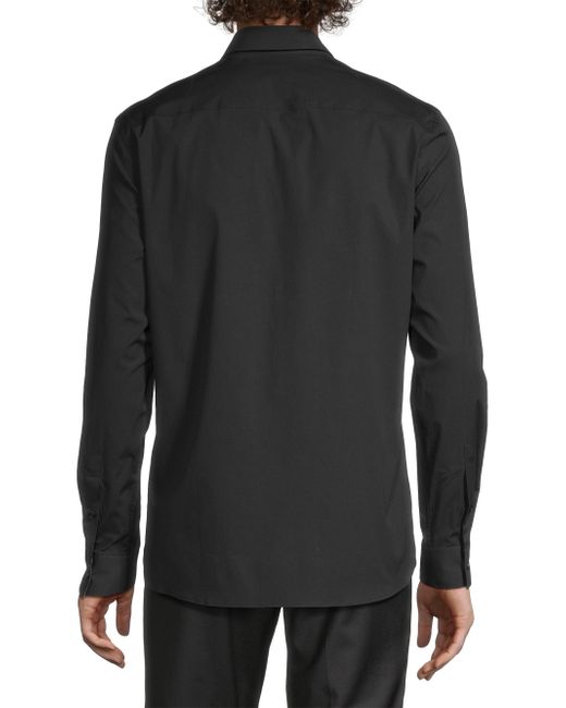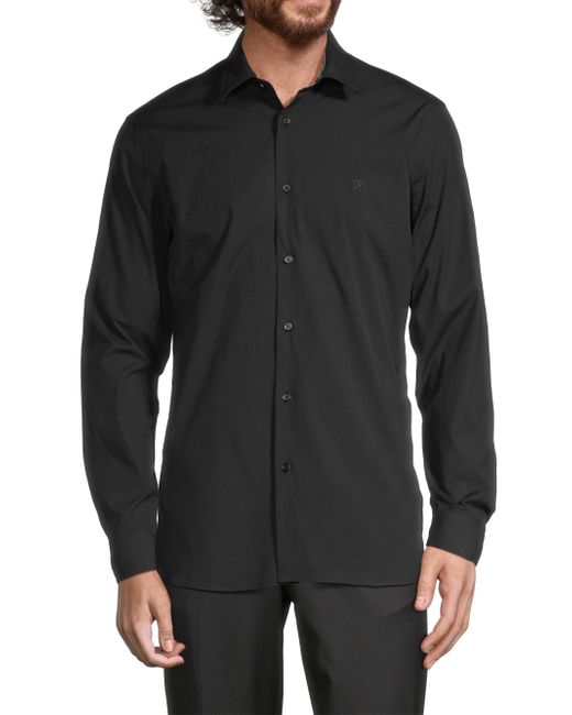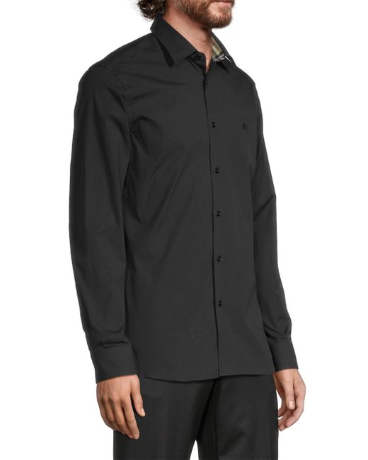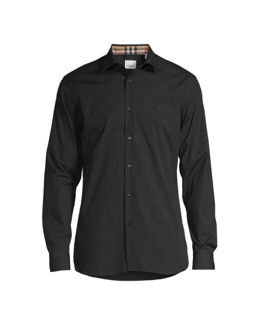 Burberry's Sherfield button-front shirt features their equestrian-inspired logo embroidered at the chest. Crafted of crisp cotton, this classic style is trimmed with the house's check print at the collar. Spread collar Long sleeves, barrel cuffs Button-front placket 96% cotton/4% elastane Machine wash Made in Italy SIZE & FIT Model measurements: 6'1" tall, 37" chest, 30.5" waist Model is wearing a US size Medium ABOUT THE BRAND Founded in 1856 by 21-year-old Thomas Burberry, the brand set out with a mission to stylishly protect against British weather-and Burberry's iconic trench coat was born. In the 1920s, its renowned check pattern was introduced as the coat's lining. Today, under Creative Director Riccardo Tisci, the heritage brand continues to evolve and create timelessly classic pieces. Men Advcd Dsgnr - Burberry > Burberry > Saks Fifth Avenue > Barneys. Burberry. Color: Black. Size: Large.