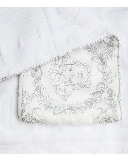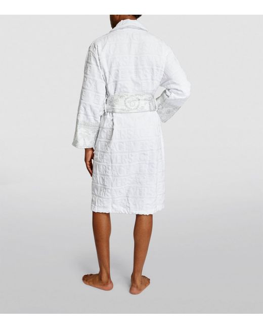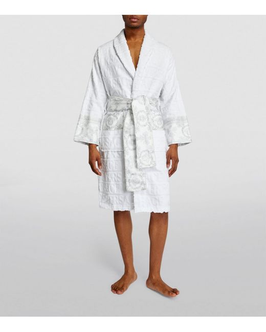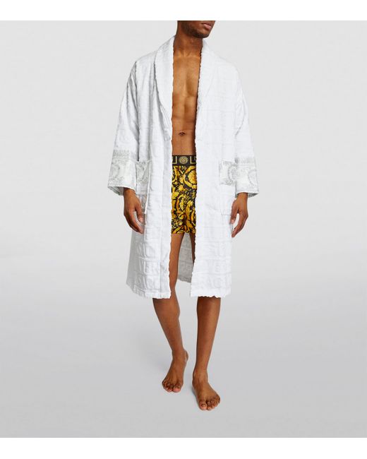 Wrap yourself in undeniable luxury with this Baroque-printed bathrobe from Versace. Crafted from premium cotton to quickly absorb water from the skin, the piece features a shawl collar, slip pockets and a self-tie waist. Punctuated with a tonal print that reads Versace and Baroque detailing to the belt and trims, it is ideal for slipping into during relaxed moments at home.