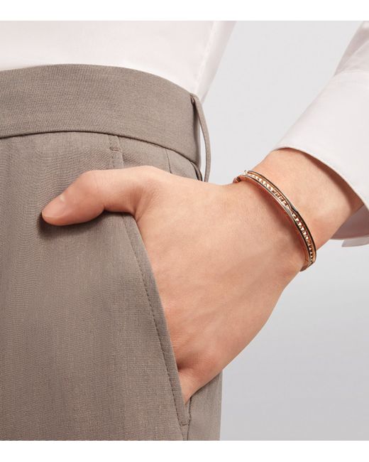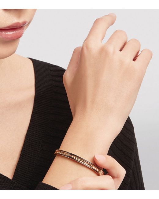 Bvlgari's B. zero1 collection draws inspiration from the grandeur of Rome's iconic Colosseum and the strong lines of modern Italian design. At once a showcase of the House's expert craftsmanship and the beauty of refined simplicity, this 18-karat rose gold and ceramic bangle contrasts a spiral of studwork with logo detailing for a contemporary yet elegant aesthetic.