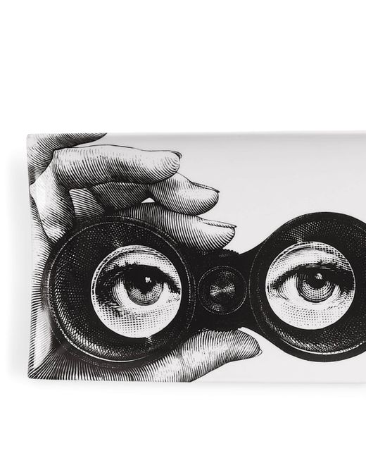 An enduring muse for Piero Fornasetti's art, opera singer Lina Cavalieri's captivating eyes are illustrated on the Occhi rectangular tray. Crafted in Italy from fine porcelain, its surreal and enchanting design elevates it to an iconic accent piece and unconventional work of art.