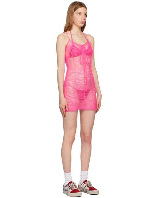 Sheer crocheted mohair- and recycled nylon-blend dress. · Scoop neck · Bow accent at chest Supplier color: Pink
