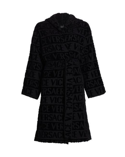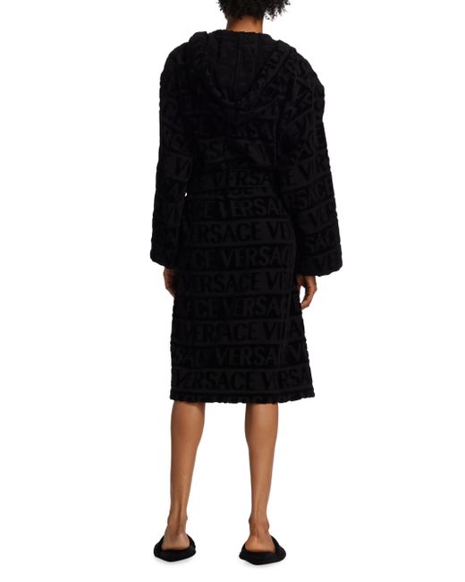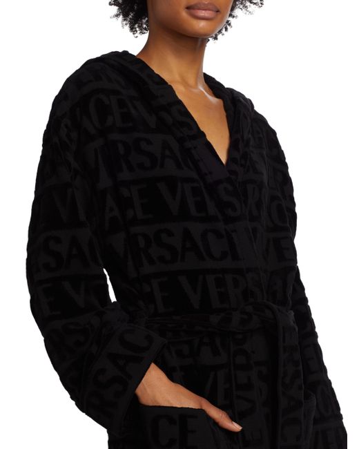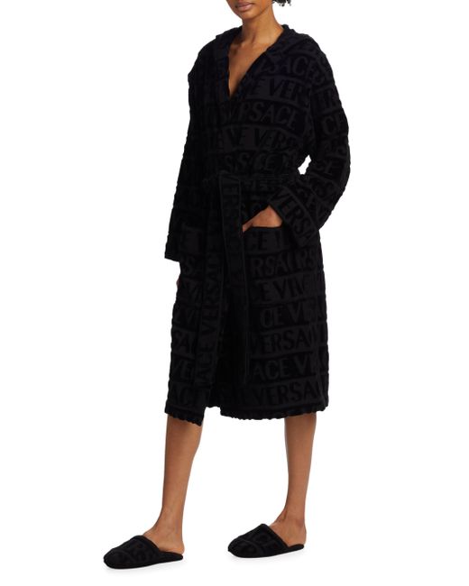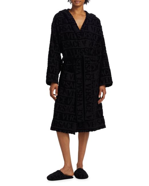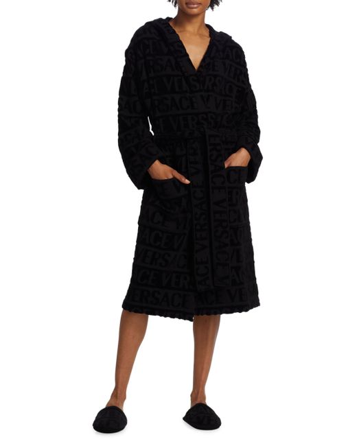 This robe from Versace flaunts a repeat logo pattern in cotton terrycloth. Attached hood Waist slip pockets Self-tie belt Cotton Machine wash Made in Italy SIZE & FIT This style is designed for a relaxed fit About 39.5" from shoulder to hem Bust, about 57" Model measurements: 5'10" tall Model is wearing a US size Small. Lingerie - Designer Foundations > Versace > Saks Fifth Avenue > Barneys. Versace. Color: Black. Size: Large.