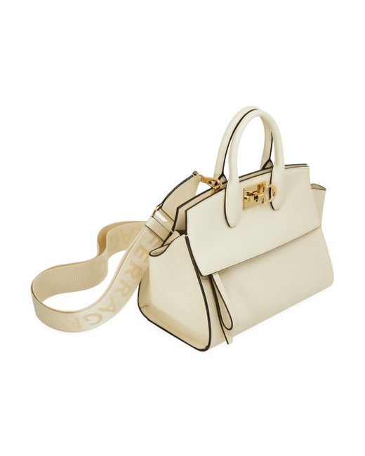 FERRAGAMO's Soft Studio top-handle bag is topped with Gancini hardware and a removable logo webbing strap. Top handle Adjustable, removable shoulder strap Metal free Turn-lock closure Leather Lining: leather Trim: nylon Made in Italy SIZE About 11.5"W x 10"H x 5.5"D ABOUT THE BRAND Italian designer Salvatore Ferragamo began his journey in 1927 in Italy with a vision of creating the world's most beautiful shoes. Since its inception, Ferragamo has expanded to include clothing, accessories and beauty under the creative direction of Maximilian Davis-who brings a minimalist-meets-maximalist aesthetic to the brand. Handbags - Ferragamo Handbags > Ferragamo > Saks Fifth Avenue > Barneys. FERRAGAMO. Color: Mascarpone.