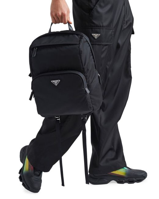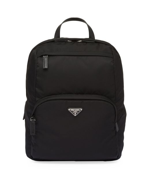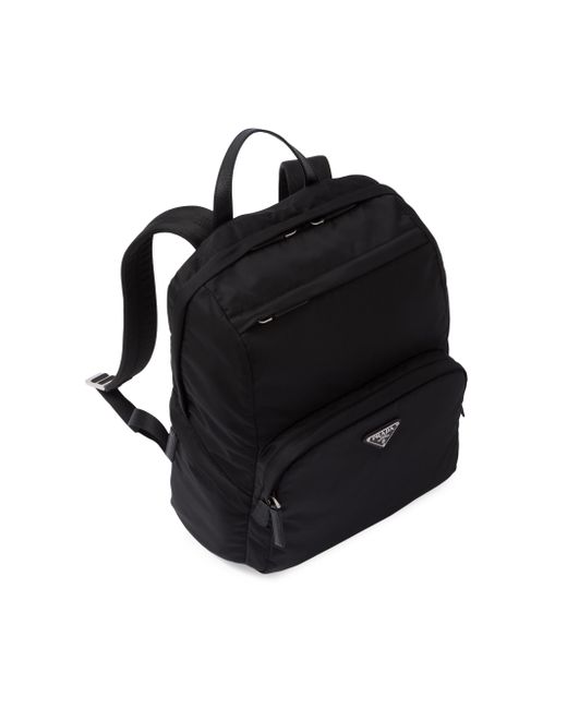 The contrast between the elegant texture of the Saffiano leather and the technical sophistication of the innovative Re-Nylon yarn epitomizes Prada's hybrid spirit in this backpack. A sophisticated, contemporary design defines this style with a zipper closure. The enameled triangle logo and padded mesh back complete the style. Saffiano handles Adjustable padded nylon webbing strap Enameled-metal triangle logo on the front Zipper closure Four outer zipper pockets Padded mesh fabric back Inside zippered pocket and patch pocket Re-Nylon lining Imported SIZE: 30 W x 39 H x 17 L (cm). Lsd Rtw - Prada Rtw > Prada > Saks Fifth Avenue > Barneys. Prada. Color: Black.