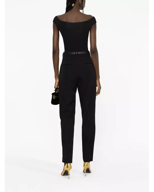 black virgin wool high waist concealed front fastening belt loops two side slip pockets two rear welt pockets split hems straight leg