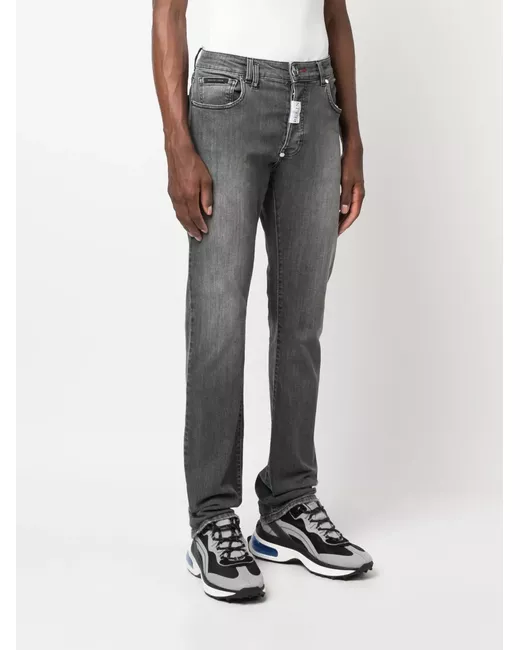 grey cotton blend denim stonewashed mid-rise belt loops front button and zip fastening classic five pockets logo patch to the front slim cut straight leg