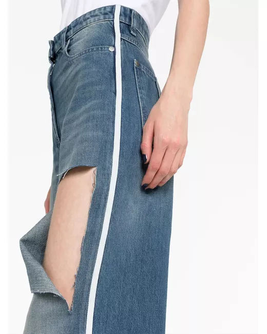 indigo blue cotton wide leg ripped detailing belt loops side stripe detailing front button and zip fastening classic five pockets
