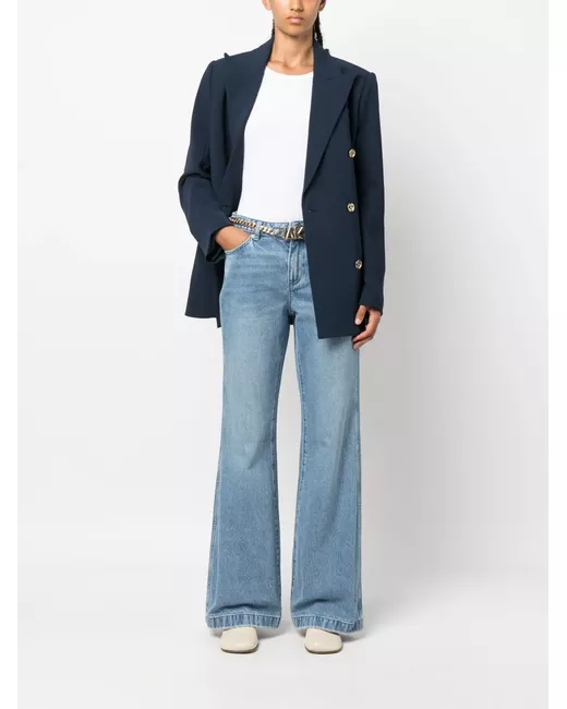 light blue cotton denim light wash gold-tone logo plaque at the rear logo-embossed gold-tone buttons detachable chain-link waist belt high waist concealed fly and button fastening classic five pockets bootcut