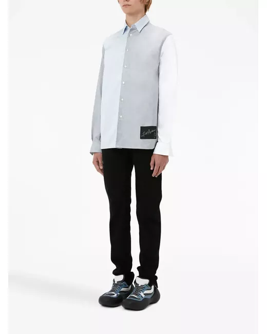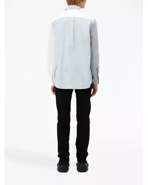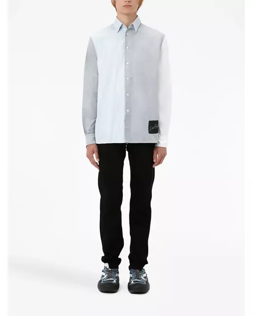light blue/light grey/white cotton patchwork design vertical stripe pattern logo patch to the front pointed flat collar front button fastening chest patch pocket buttoned-cuff sleeves straight hem